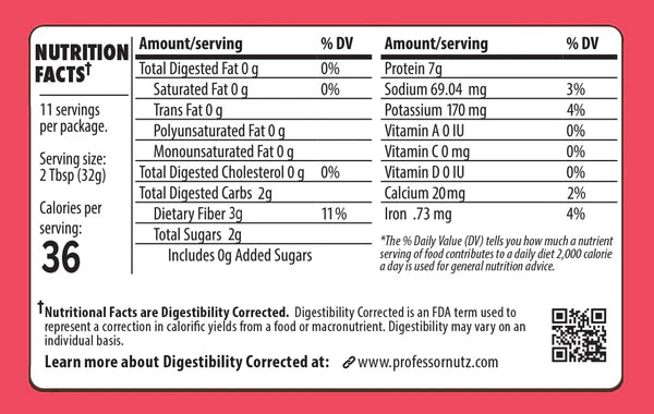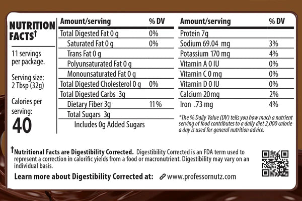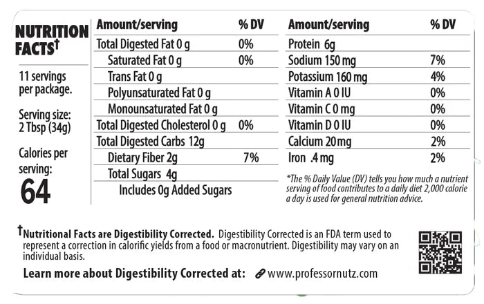 Professor Nutz™ has been “corrected” to digest very little fat or carbs. Our goal was zero. How much you actually digest will vary.